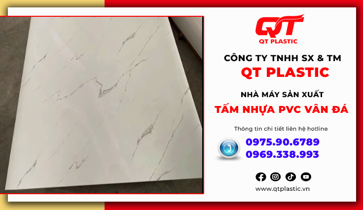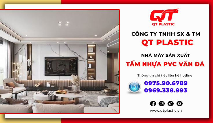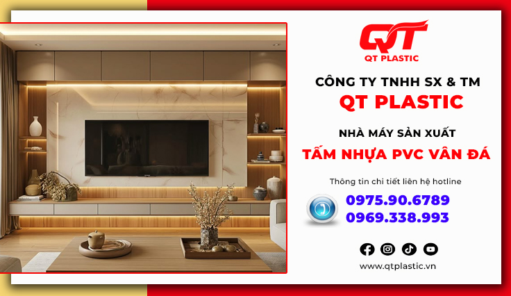 Kết luận: Với sự kết hợp giữa tính thẩm mỹ cao, độ bền vượt trội và chi phí hợp lý, tấm nhựa Pvc vân đá làm vách tivi phòng khách đang trở thành xu hướng nội thất được ưa chuộng. Lựa chọn QT Plastic – nhà máy cung cấp trực tiếp tại Bắc Ninh chính là giải pháp thông minh giúp công trình đạt hiệu quả cả về chất lượng lẫn kinh tế, đồng thời mở ra hướng đi bền vững cho các đơn vị thi công và phân phối nội thất.