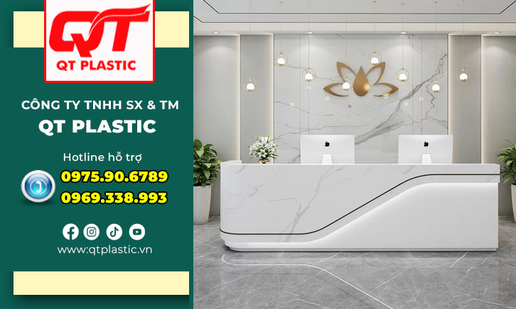 Quầy lễ tân nhựa Pvc vân đá không chỉ là nơi đón tiếp mà còn là điểm nhấn thẩm mỹ và biểu tượng thương hiệu trong không gian doanh nghiệp.