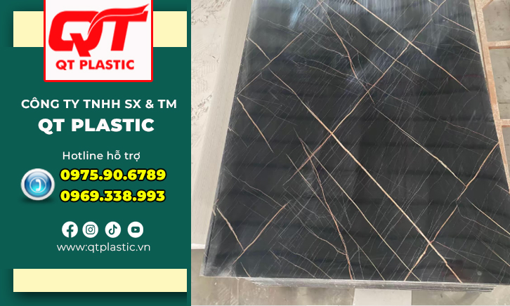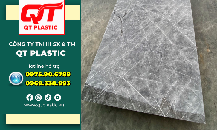 Tấm nhựa Pvc vân đá là vật liệu trang trí nội thất thế hệ mới, làm từ nhựa Pvc nguyên sinh (Polyvinyl Chloride) kết hợp bột đá tự nhiên và các phụ gia cao cấp, được sản xuất trực tiếp tại nhà máy QT Plastic sản xuất trên dây chuyền ép đùn công nghệ cao, đảm bảo độ chính xác và đồng nhất trong từng chi tiết. Bề mặt được phủ lớp film in vân đá sắc nét, mô phỏng tinh tế từng đường vân, màu sắc và chiều sâu của đá thật. Nhờ công nghệ in hiện đại, sản phẩm mang lại vẻ đẹp sang trọng, chân thực và phù hợp với nhiều phong cách nội thất.
