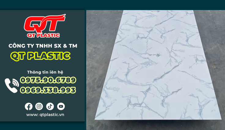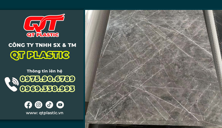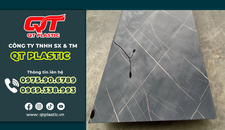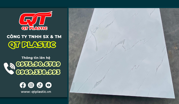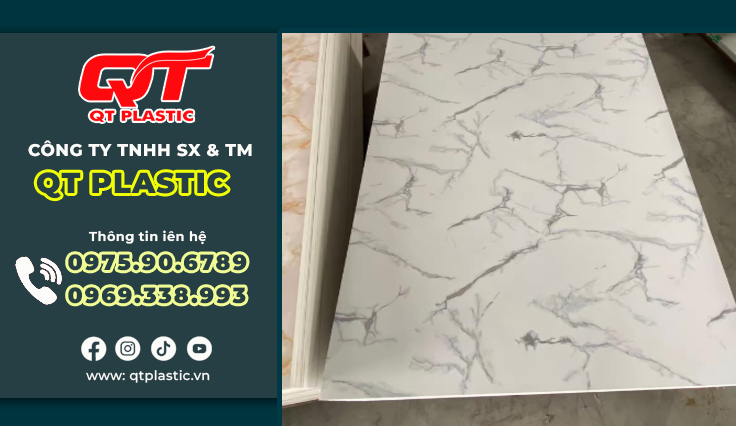 Nhà máy QT Plastic chú trọng chất lượng từ nguyên liệu đến thành phẩm, lựa chọn nhựa Pvc cao cấp kết hợp phụ gia tăng cường độ bền, khả năng chống ẩm, chống trầy xước và dễ vệ sinh. QT Plastic một trong những nhà máy dẫn đầu khu vực miền Bắc trong sản xuất tấm nhựa Pvc vân đá chất lượng cao. Với sứ mệnh mang đến giải pháp nội thất vừa sang trọng vừa bền bỉ, QT Plastic không ngừng áp dụng công nghệ sản xuất tiên tiến, đảm bảo mỗi tấm nhựa Pvc vân đá đều có bề mặt sống động, đường vân tinh tế và màu sắc đa dạng, mô phỏng đá tự nhiên một cách chân thực.