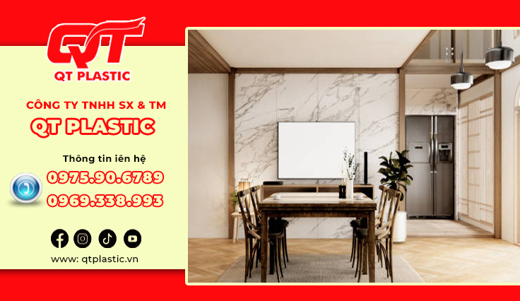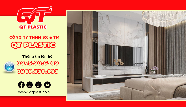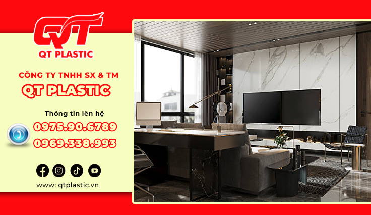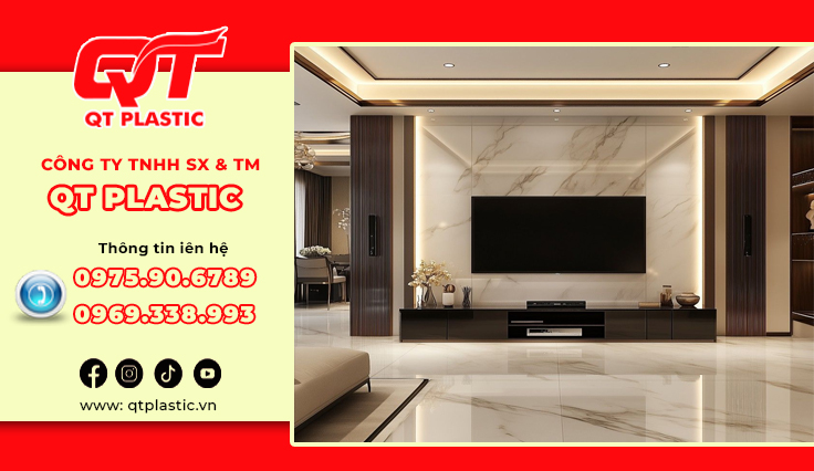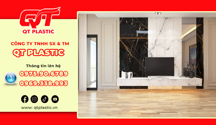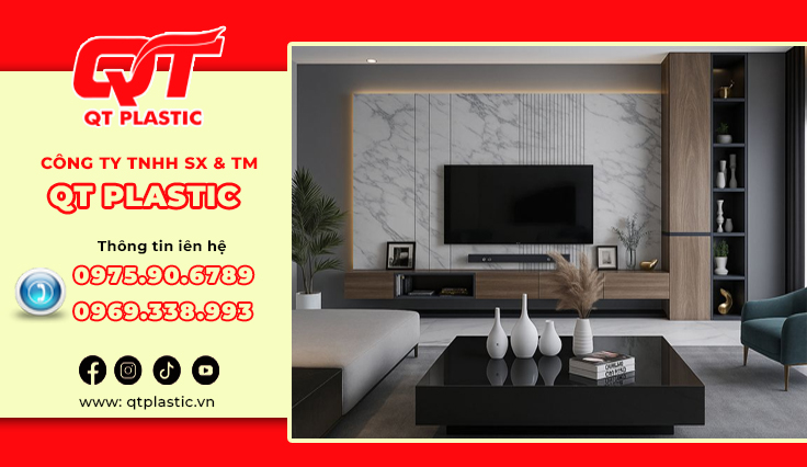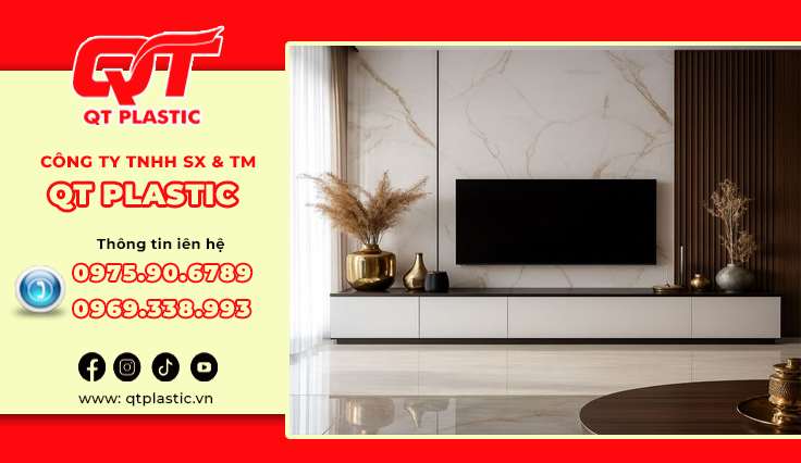Trong xu hướng nội thất hiện đại, tìm kiếm một giải pháp ốp tường hiện đại, sang trọng, thay thế hoàn hảo cho đá tự nhiên hay gạch men truyền thống? Những vật liệu nhựa đang làm làm mưa làm gió trên thị trường nội thất hiện nay. QT Plastic – Nhà máy sản xuất tấm nhựa Pvc vân đá trực tiếp hàng đầu Việt Nam, cung cấp các sản phẩm Pvc vân đá chất lượng. Tấm nhựa Pvc vân đá làm vách tivi mang đến điểm nhấn ấn tượng cho không gian phòng khách hoặc phòng giải trí. Bài viết này sẽ giới thiệu chi tiết về sản phẩm, lợi ích và ứng dụng đa dạng của tấm nhựa Pvc vân đá trong trang trí nội thất, đang trở thành lựa chọn yêu thích nhờ tính thẩm mỹ cao, dễ thi công và chi phí hợp lý.
